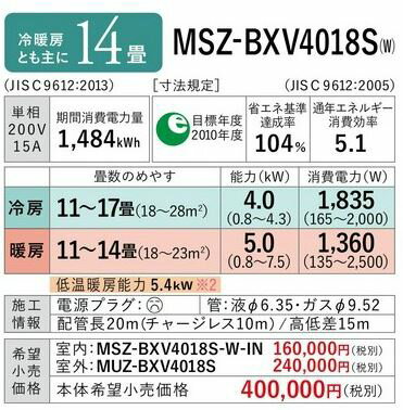 《あす楽》◆15時迄出荷OK!三菱 ルームエアコン【MSZ-BXV4018S W】2018年 ウェーブホワイト 霧ヶ峰 BXVシリーズ 単相200V 主に14畳 (旧品番 MSZ-BXV4017S W)