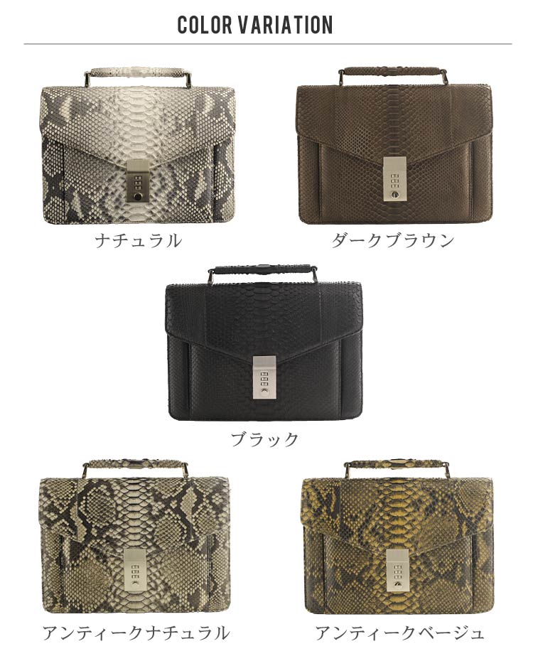 商品詳細 ●デザインビジネスシーンに極上のインパクトを残すパイソンレザーのメンズハンドバッグ スマートフォンなどの小物収納ポケット、ファスナー付きのポケットも備えており、整理しやすく使いやすいデザイン。